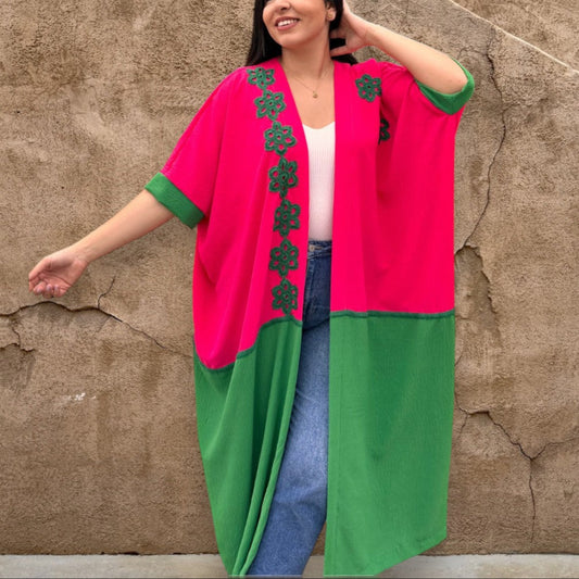 Fuchsia with Green Crochet Kimono